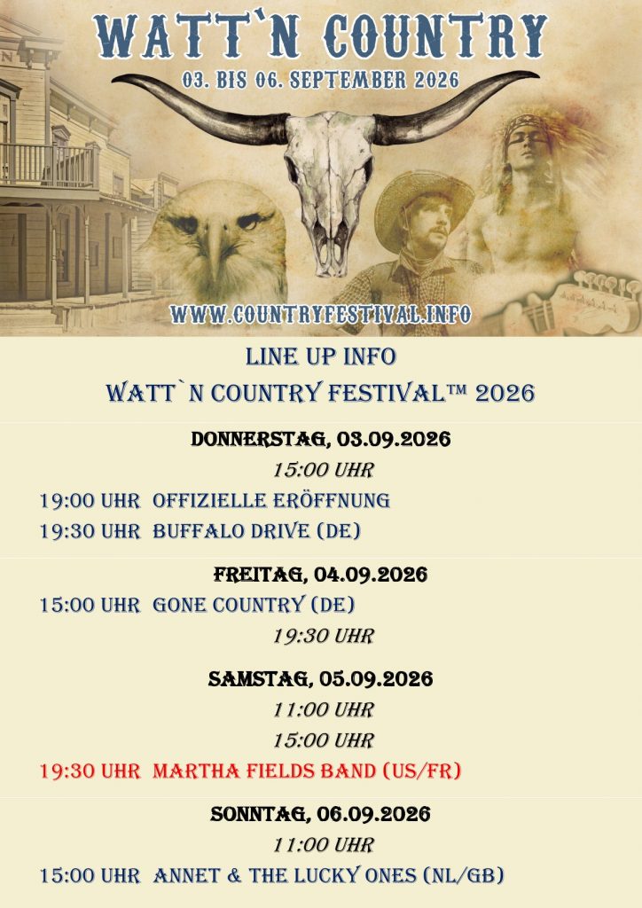 Hier können Sie die Tickets für das WATT`N COUNTRY FESTIVAL 2026 erwerben.