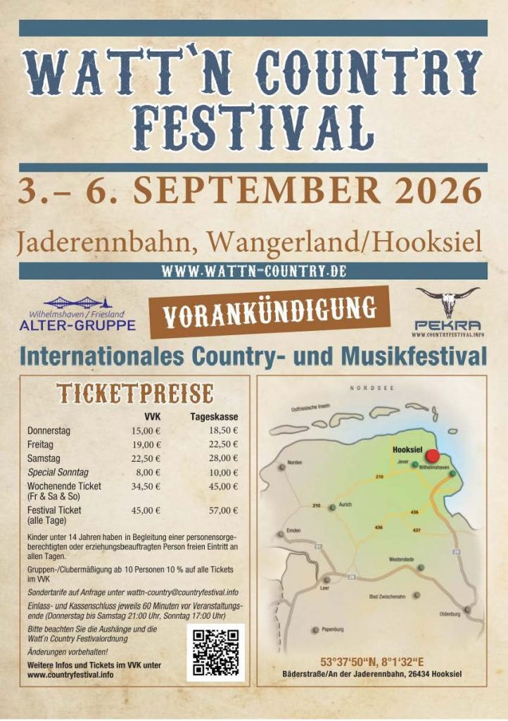 Hier können Sie die Tickets für das WATT`N COUNTRY FESTIVAL 2026 erwerben.