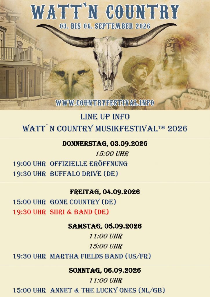 Hier können Sie die Tickets für das WATT`N COUNTRY FESTIVAL 2026 erwerben.